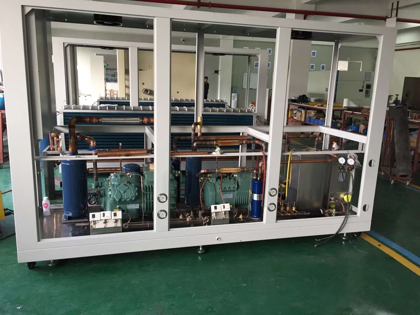 恒溫恒濕試驗箱一般正常情況下,風(fēng)扇出來的風(fēng)是熱的,如果出來的風(fēng)是冷的,那就是漏冷媒問題,這就該要觀察壓力表:如果低壓低,制冷量下降,回氣溫度升高,排氣溫度升高,蒸發(fā)壓力又很低低于2-3KG,就不正常了,此時應(yīng)懷疑冷媒是否泄漏。如果停機(jī)時間過長,一開機(jī)蒸發(fā)壓力迅速從溫度對應(yīng)壓力降到2-3KG也要檢查冷媒是否泄漏。