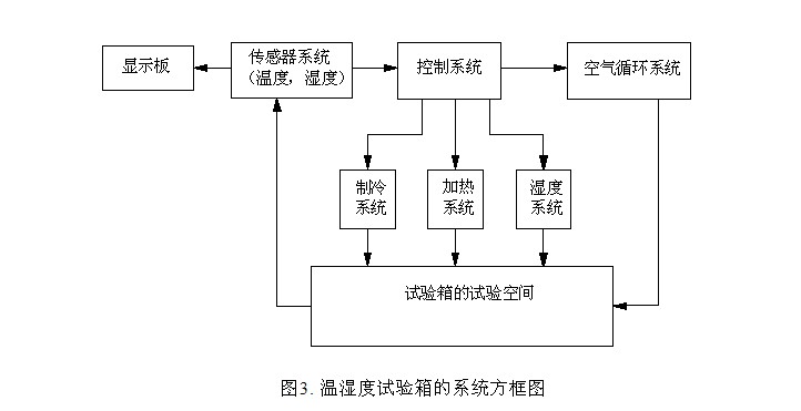 恒溫恒濕試驗(yàn)箱對(duì)試驗(yàn)樣品進(jìn)行溫濕度試驗(yàn)。恒溫恒濕試驗(yàn)箱主要由制冷系統(tǒng),加熱系統(tǒng),控制系統(tǒng),濕度系統(tǒng),空氣循環(huán)系統(tǒng),和傳感器系統(tǒng)等組成,系統(tǒng)方框圖見(jiàn)下圖